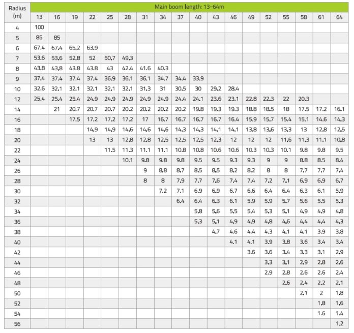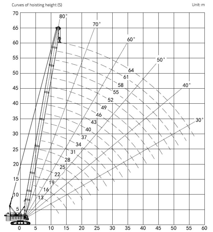 | Длина основной стрелы (S): 13~64 м | Максимальная грузоподъёмность с фиксированным F-гуськом (SF): 12 т |