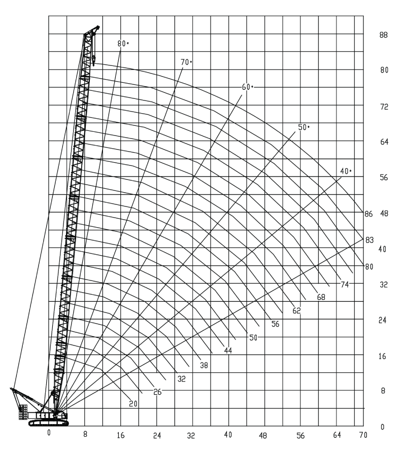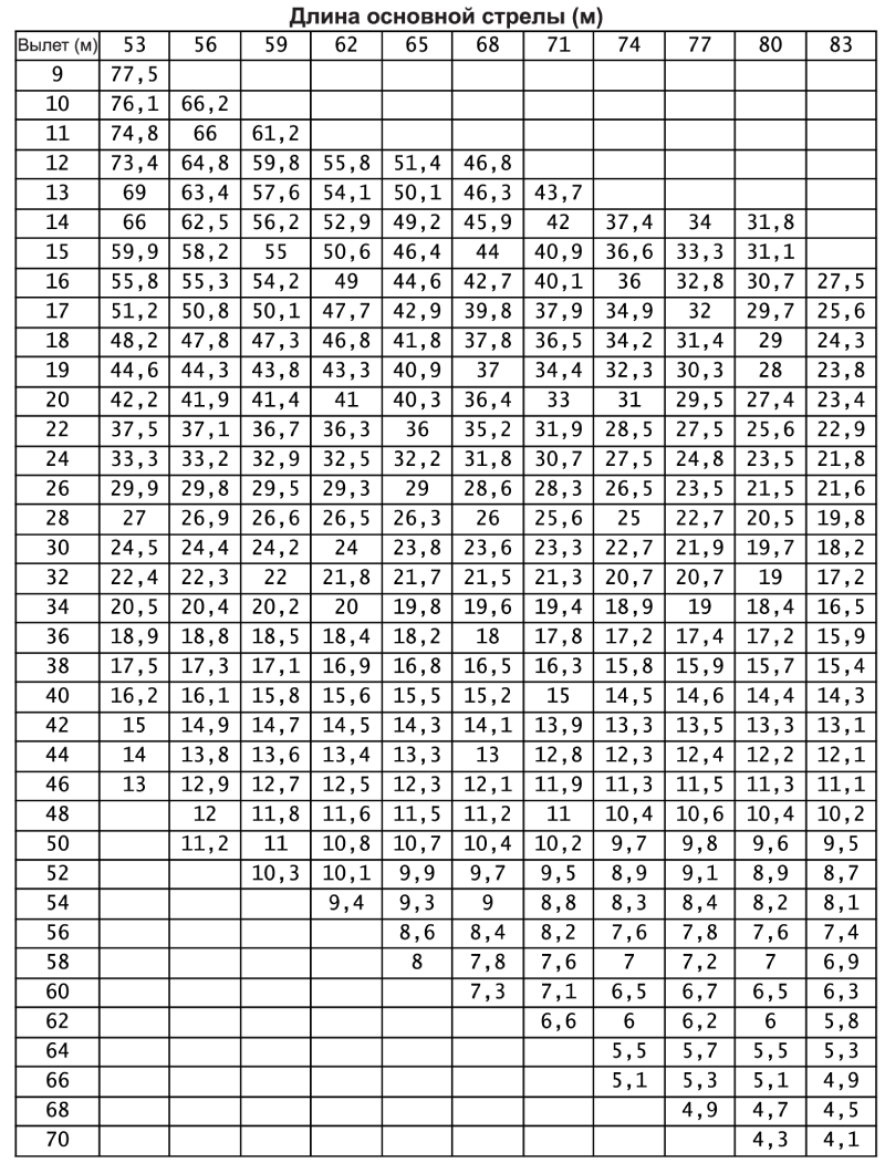 Длина основной стрелы (S): 20~83 м Максимальная грузоподъёмность с фиксированным F-гуськом (SF): 25 т