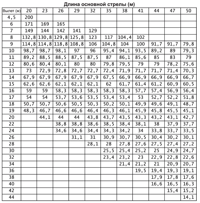 Максимальная грузоподъёмность x вылет 200 т x 4,5 м