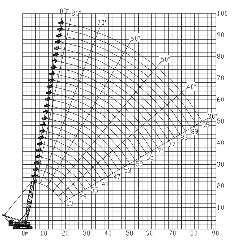 | Длина основной стрелы (S): 20~83 м | Максимальная грузоподъёмность с фиксированным F-гуськом (SF): 34 т |